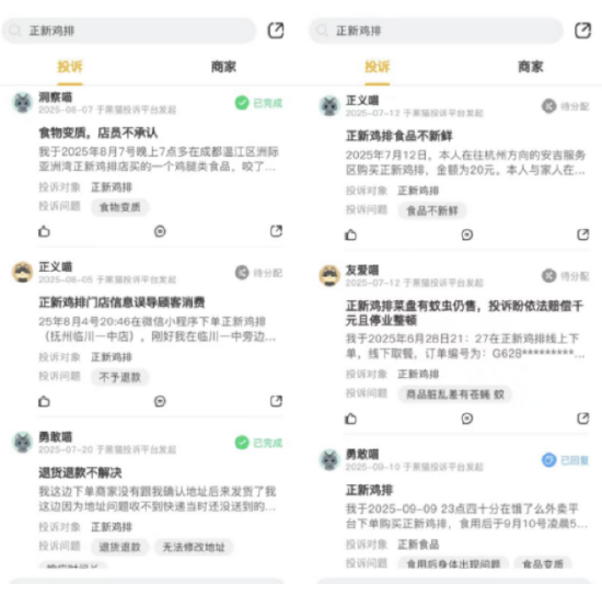 正在黑猫赞扬 上,取正新鸡排相关的赞扬达到了1338条,大多客诉也都集中于食材不新颖和有卫生问题。从卫生不达标、利用过时原料、老鼠出没到本年的食材生蛆,正新鸡排的口碑早已滑坡。同时,《BUG》栏目也留意到,正新鸡排鲜有对整改办法进行披露,也几乎正在官网、号等平台上找不到对食物平安的声明和传递。对比正新鸡排的品控不力,“鸡排哥”却自动向顾客展现杭州、南昌对鸡排、油等成品、原材料的检测演讲,并称多批次检测均为及格,“食物平安及卫生都是能够的,都是达标的”,还暗示本人一曲以来都很注沉食物平安。