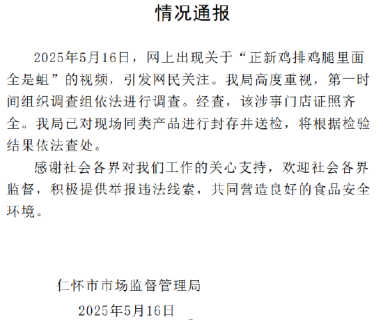 而这也不是正新鸡排第一次呈现食物平安问题。2022年10月,市区市场监视办理局发布关于餐饮业食物平安大查抄发觉问题的措置传递,此中提到,正新鸡排首喷鼻餐饮核心店当事人加工、制做食物的东西器具未能公用的行为,违反了相关。市区市场监视办理局对其下发责令更正通知书,要求其当即更正。2023年11月,湖南省张家界市永定区市场监视办理局法律人员对一家正新鸡排门店进行查封,缘由是该店存正在食物平安问题。2024年7月,有网友发帖称其正在江西省赣州市章贡区的一家正新鸡排店打工时,发觉该门店存正在苍蝇污染食物、烹炸用油频频利用20多天不换油等卫生平安现患。章贡区市场监视办理局及时介入,对涉事门店的用油问题展开专项查抄。